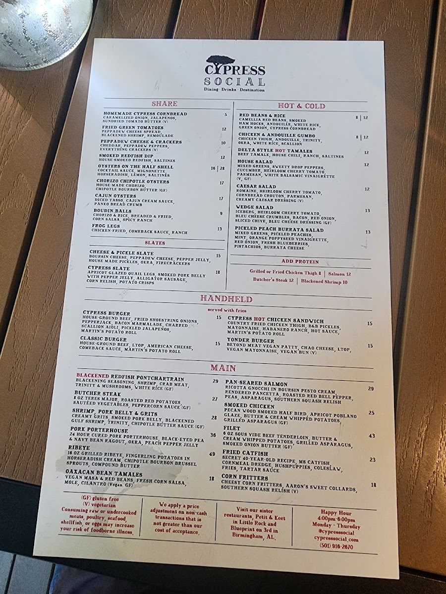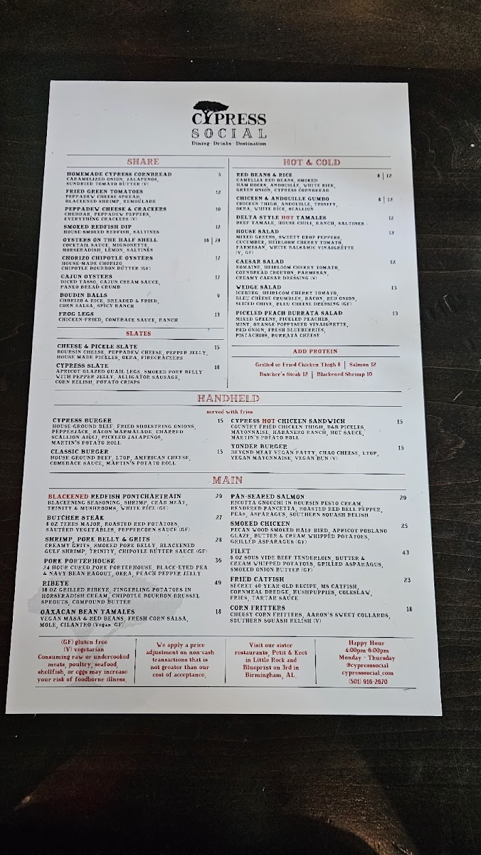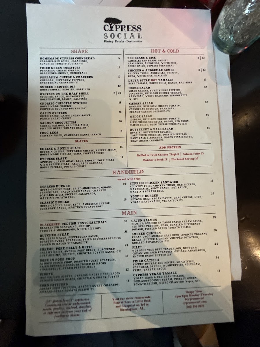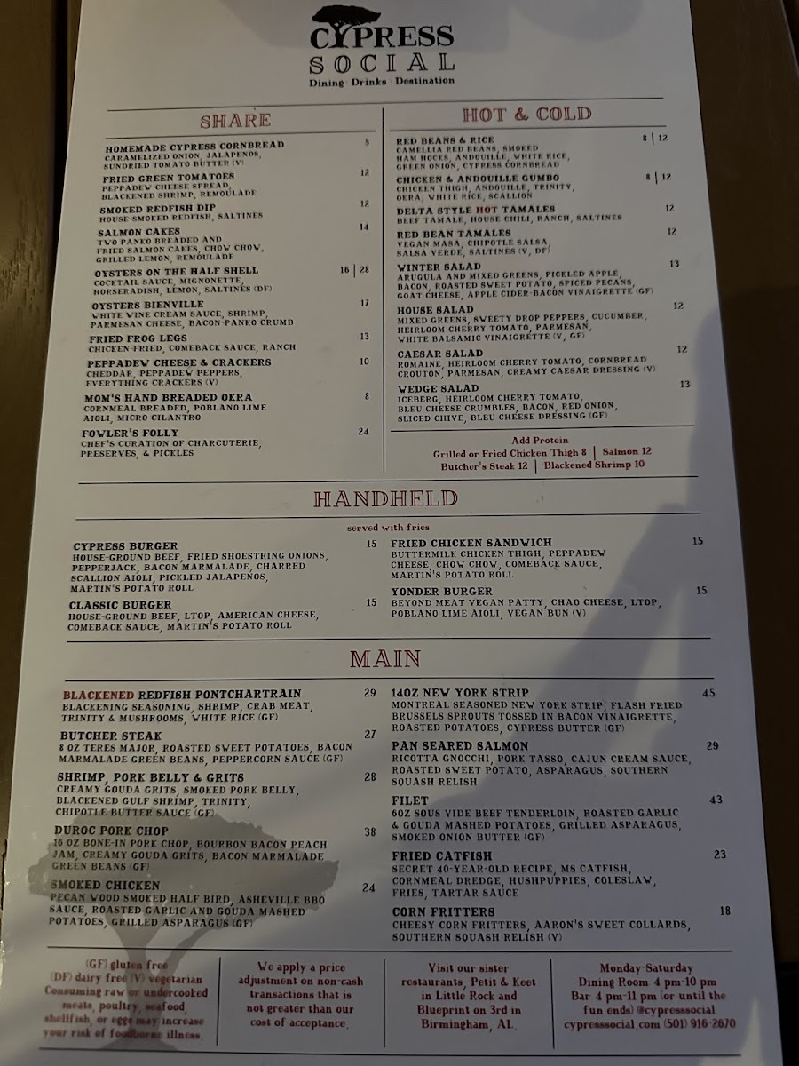 The menu at Cypress Social offers a thoughtful blend of Southern-inspired dishes and comforting flavors, perfectly suited for relaxed gatherings and special occasions alike. From shareable starters like the homemade Cypress cornbread with sundried tomato butter to hearty mains such as the Blackened Redfish Pontchartrain, the selection invites diners to savor familiar ingredients with a refined touch.