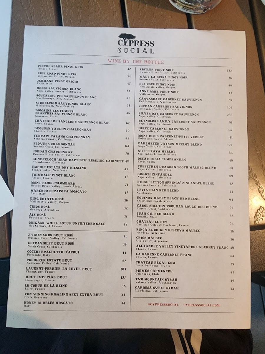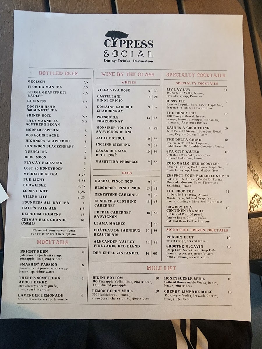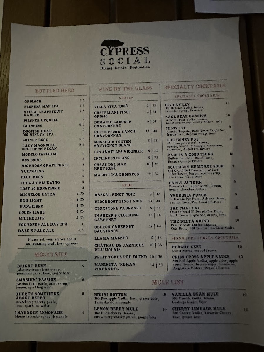 Overall, the food and drink offerings at Cypress Social align well with the inviting vibe of the venue—where friendly service and a relaxed, cozy atmosphere encourage guests to linger and enjoy the moment.